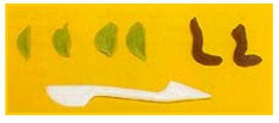 Después para hacer las hojas tiñe la masa de porcelana fría de verde. Estira con palo de amasar y corta las hojas con esteca. Marca las nercaduras. Para hacer el tronco tiñe la masa de color marrón. Modela un riollo y marca finas líneas con la esteca, para lograr un efecto de rama. Da movimiento, curvando una de sus puntas.