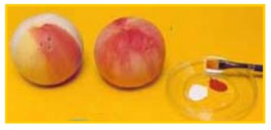 Una vez seca la masa, pinta la base con una mezcla de acrílico blanco y amarillo. Prepara un color durazno agregando rojo a la mezcla anterior y cubre toda la superficie. Cubre algunos sectores con un tono más oscuro, agregando una pizca de marrón al rojo. Esfuma los colores integrándolos cuando están húmedos.