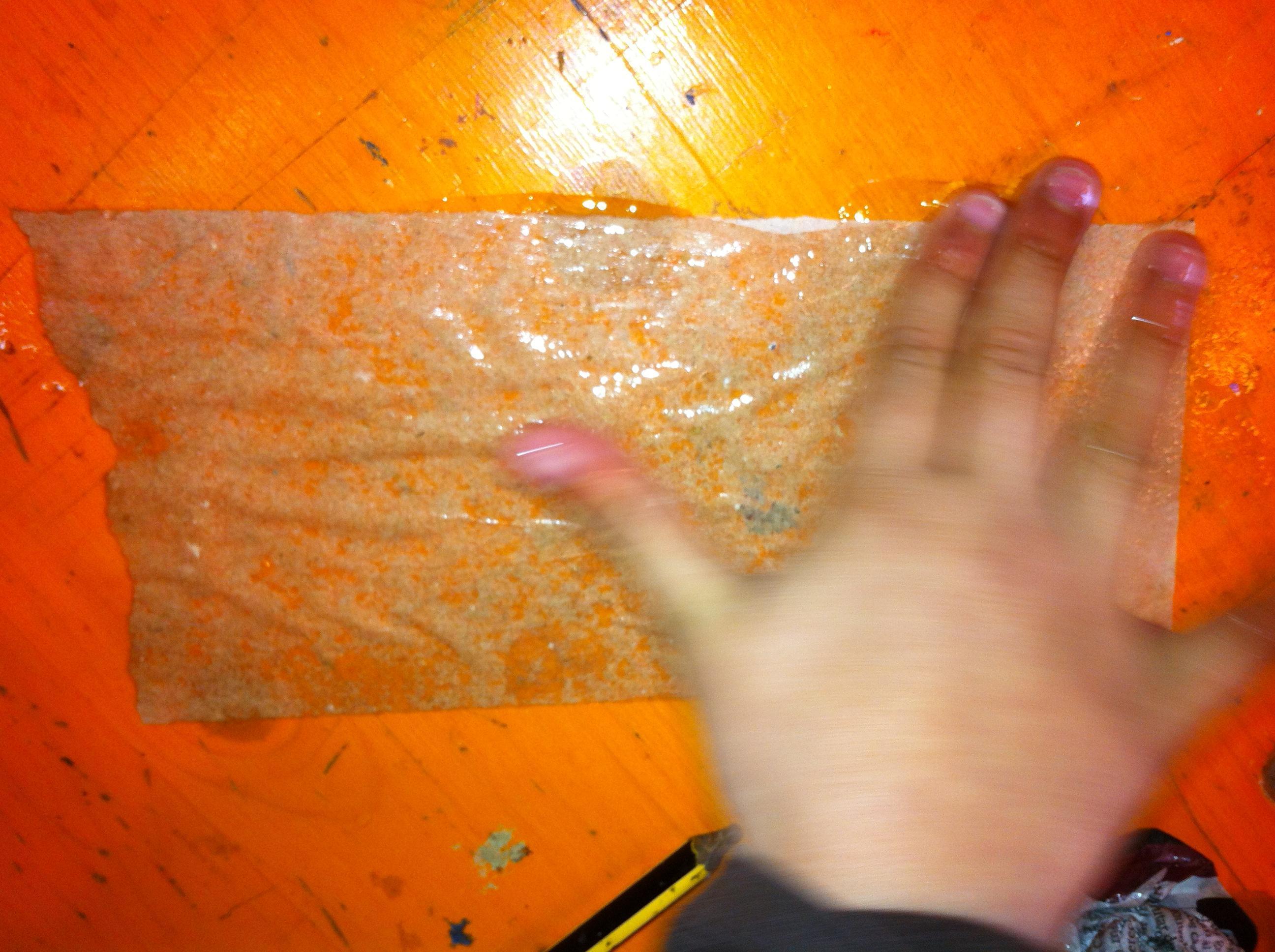Haz una mezcla de cola con agua en un recipiente. Coge un trozo de papel de seda marrón y mójalo abundantemente con tus dedos mojados con la mezcla de cola y agua.