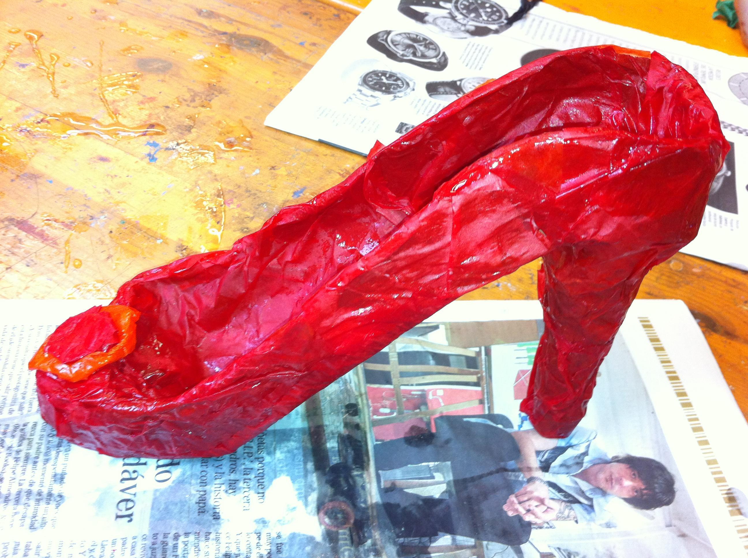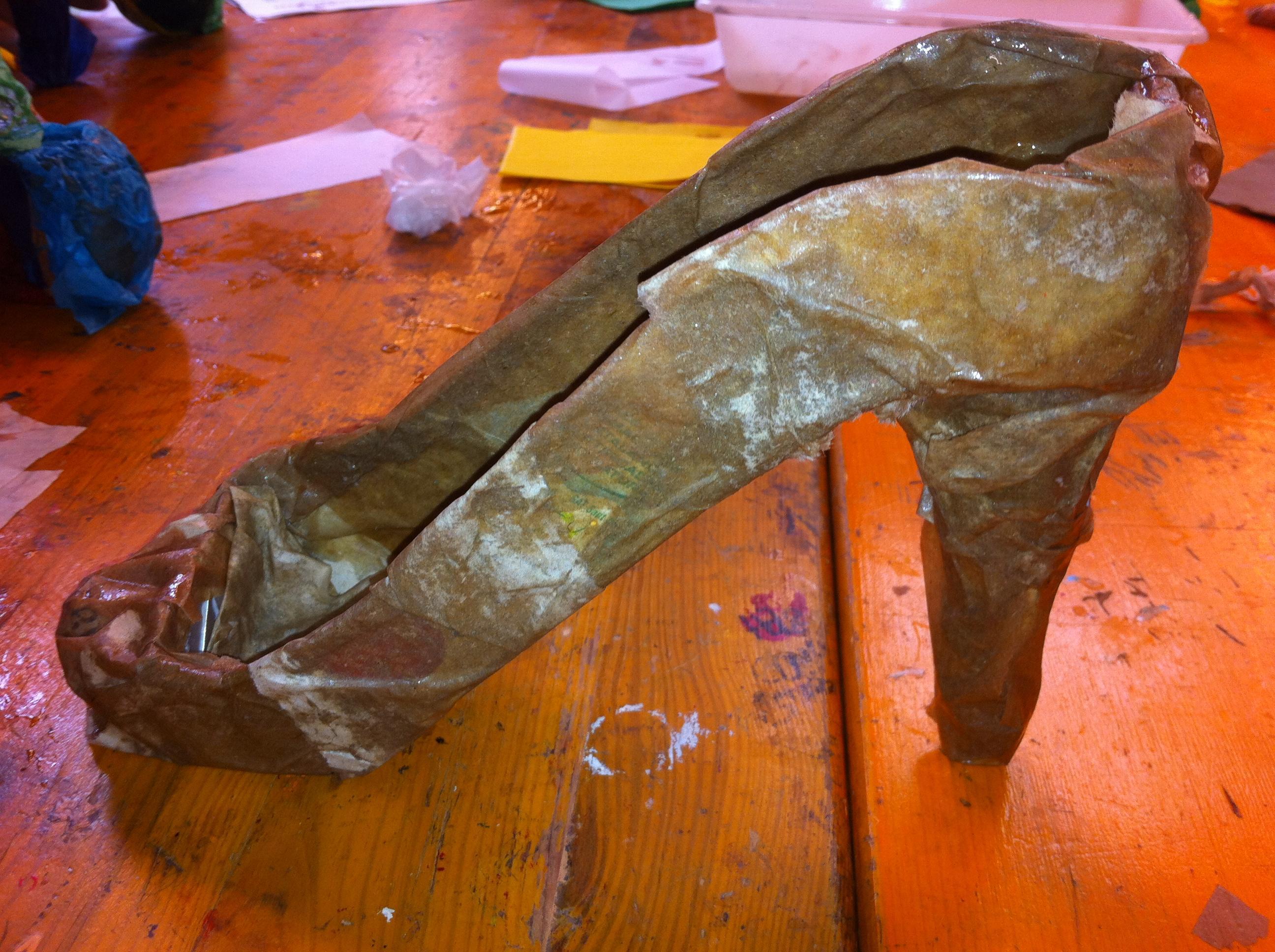 Este trozo de papel de seda servirá para pegar la bola de papel de periódico en la punta del zapato. Coloca la bola en la punta y, encima de esta, el papel mojado con cola y agua y pégalo bien al zapato. Después de esto, cogerás más papel de seda marrón y empezarás a forrar todo el zapato (por dentro y por fuera, tacón incluido).