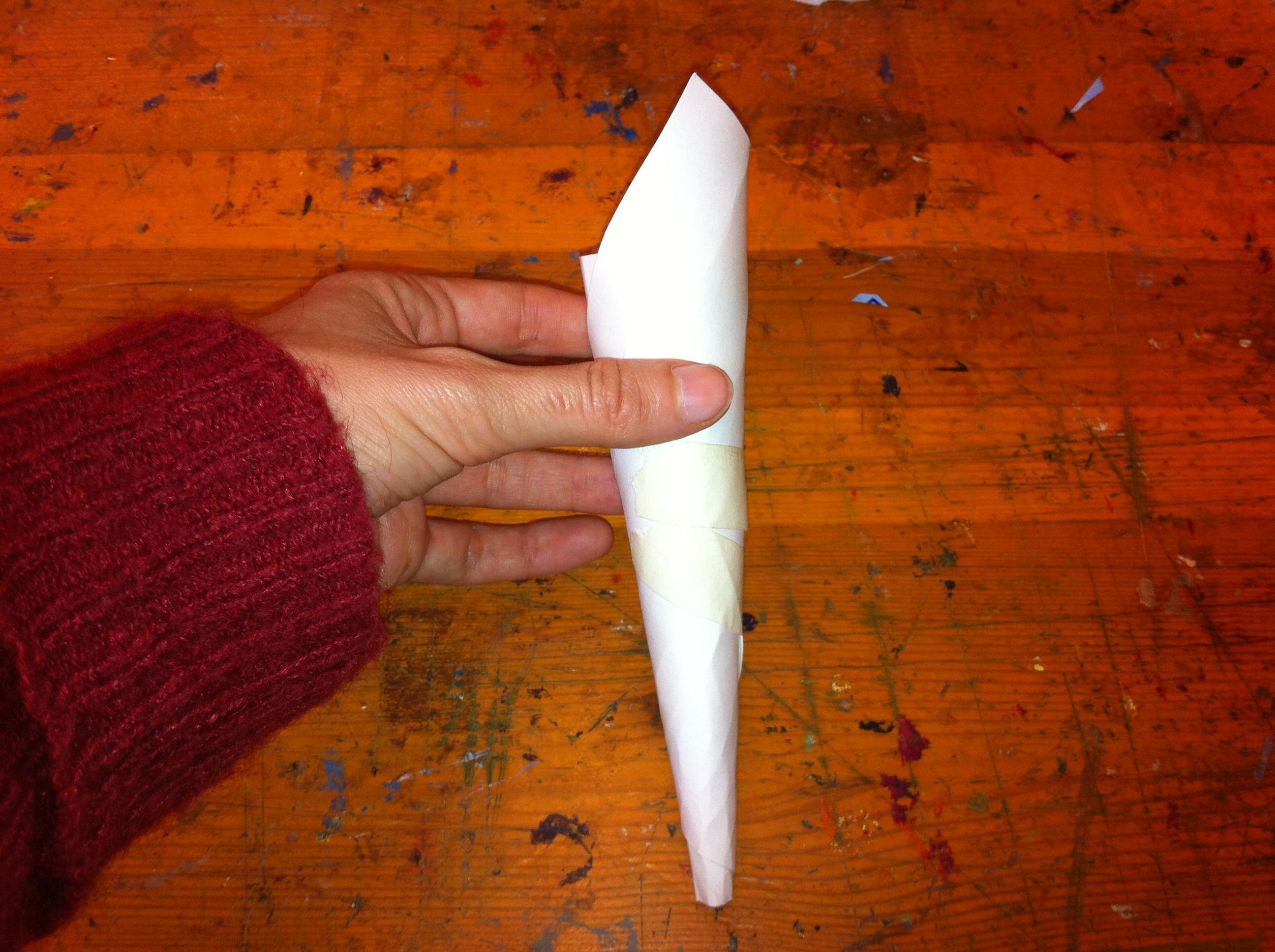 Ahora toca hacer el tacón del zapato. Para ello, coge un trozo de cartulina y enróllalo como un cono. Si quieres que el tacón sea más grueso no lo apretes mucho. Con un trozo de cinta adhesiva fíjalo para que el cono no se mueva.