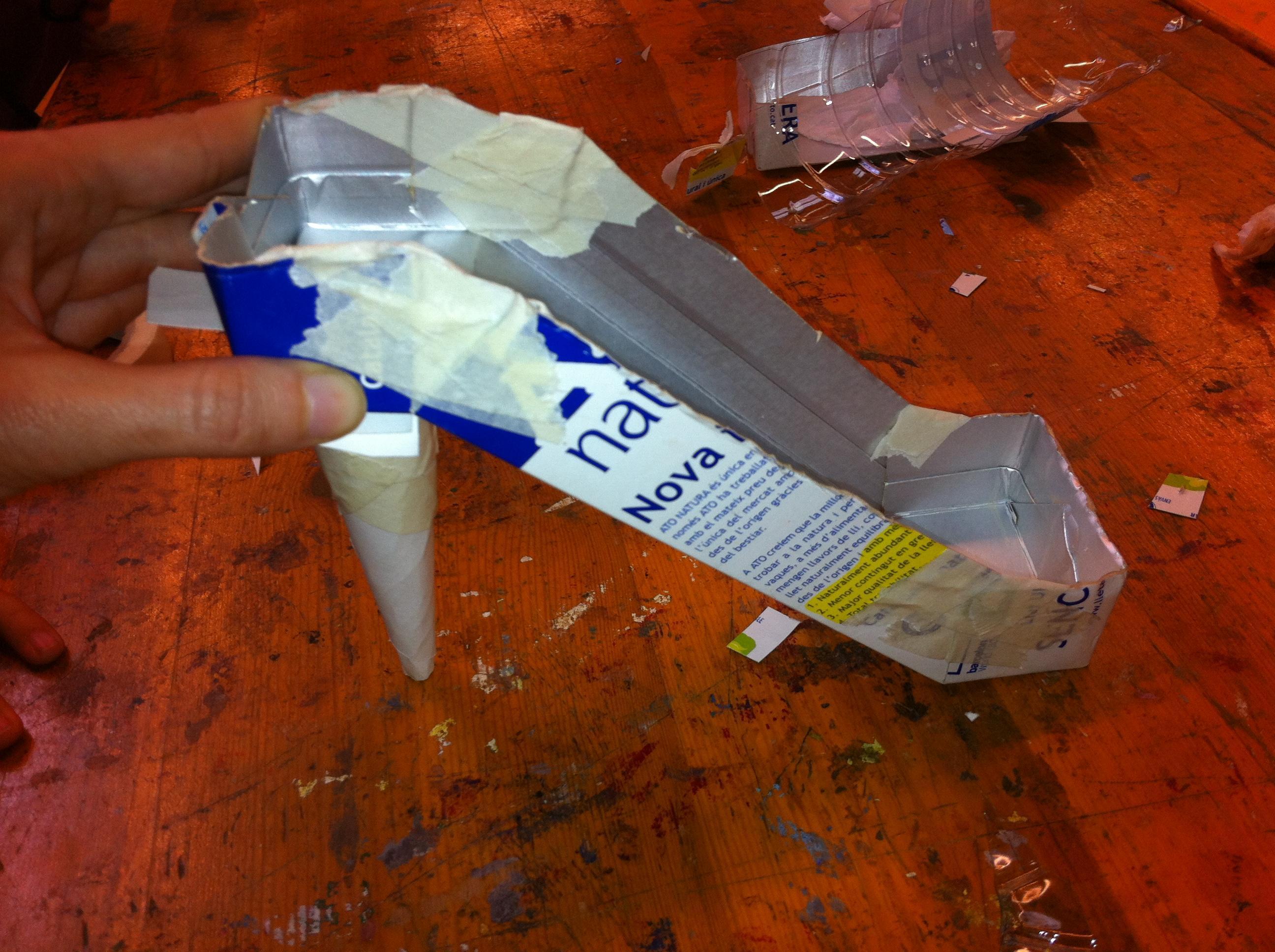 Utiliza cinta adhesiva para pegar las tres partes dándole ya la forma del zapato. Si utilizas cinta adhesiva de papel será mucho más fácil de manejar y la podrás cortar con tus dedos. Es muy importante que la forma del zapato quede bien fijada así que utiliza bastante cinta adhesiva.Es muy importante que las partes de la punta y el tacón del zapato sean completamente paralelas entre ellas y con las mesa para que éste se aguante perfectamente de pie.Escoge el ángulo del zapato según el tacón que quieras (yo quiero hacerlo de tacón alto)