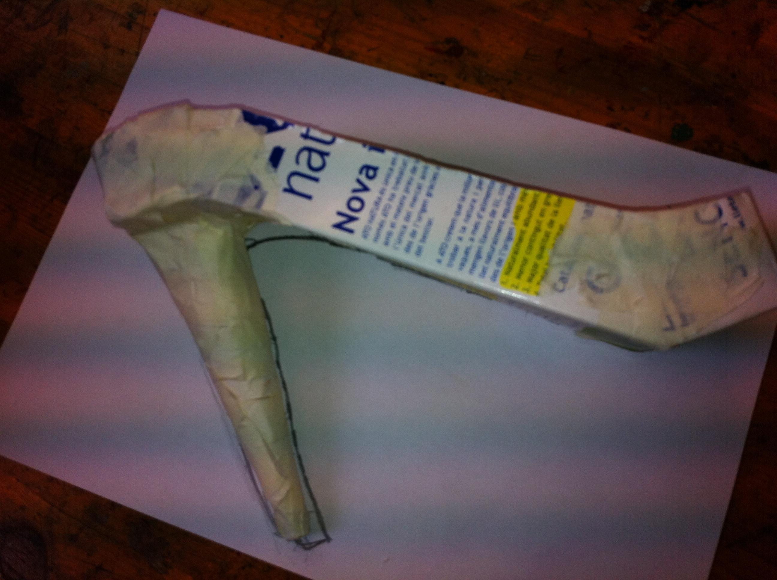 Corta el tetra brick longitudinalmente por la mitad con ayuda de unas tijeras o un cúter. Después, haz cuatro cortes como te mostramos en la fotografía. De esta manera habrás dividido el tetra brick en tres partes: una para la punta del zapato (la más corta), otra para el empeine (la más grande) y la última para el tacón (la mediana)