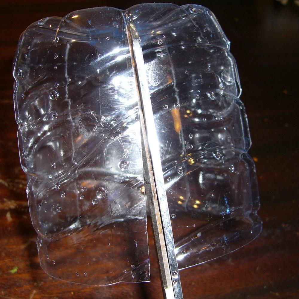 Llega el momento de cortar los pétalos de la flor. Hazlo dividiendo la botella en cinco pedazos y cortándola tal y como observas en la imagen. El centro de nuestra flor será el fondo de la botella.