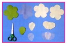 Primero de todo Corta en raso 2 piezas del molde de la flor entera (N° 1) y 1 pieza en gaza. Corta según el molde de los pétalos (N° 2), 13 pétalos en raso y 13 pétalos en gasa.