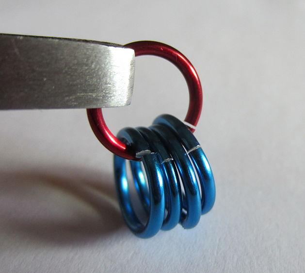 Coloca 4 anillos de color del borde en el anillo abierto. A continuación, cierra el anillo abierto torciendo los extremos de nuevo juntos. A esta unidad se la llama “pequeña cadena”.
