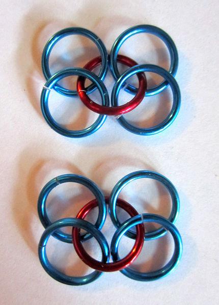 Coloca la pequeña cadena sobre una superficie plana. El anillo central debe ir debajo de dos anillos, y arriba de los otros dos anillos. Puede que tengas que girar los anillos un poco, pero es muy importantes que los coloques de esta manera.