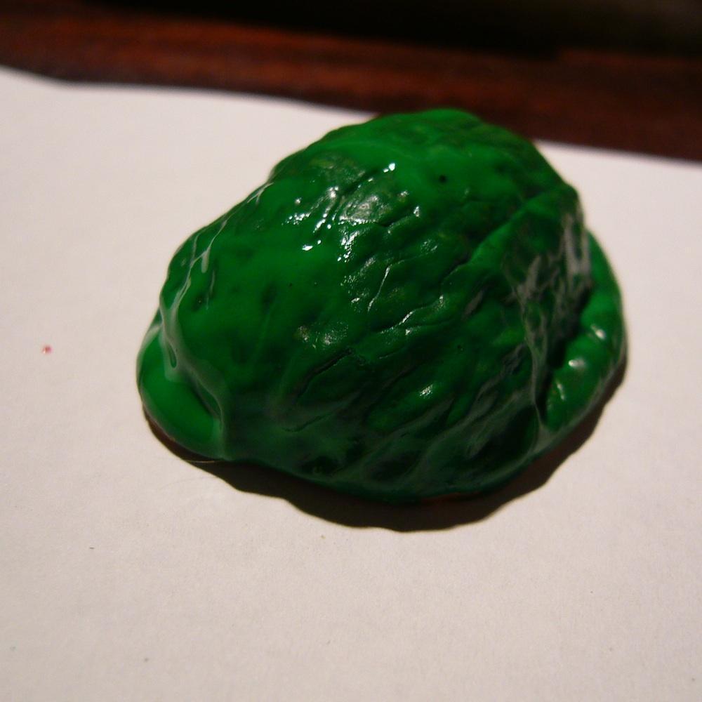 Pinta la cáscara de nuez de la rana de color verde. Utiliza un color verde oscuro para simular lo mejor posible el color de la rana.