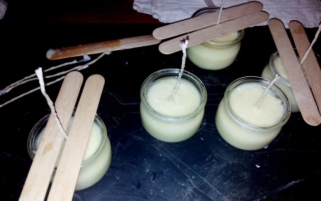 Ve con cuidado de que la mecha no se caiga y se pegue al resto de la mezcla porque, entonces, te quedarás sin vela. Si ves que no logra estar recta puedes ayudar a sujetarla erguida colocando dos objetos que la presionen y la mantengan recta.