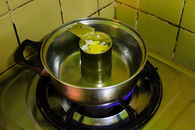 Llena otra olla más grande hasta el tope con agua. Comprueba que la lata más pequeña que contiene la cera puede caber dentro de la olla más grande, con espacio de sobra. Lleva el agua a hervir y luego coloca la lata con la cera en el interior de la olla más grande. Deja que la cera se derrita lentamente hasta que es de consistencia líquida.
