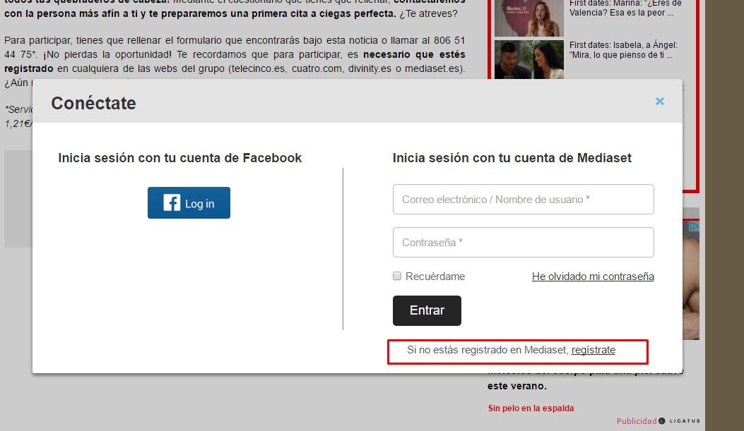 Si escoges la segunda opción debes saber una cosa: para poder registrarte como un candidato, lo primero que tienes que hacer es registrarte en Mediaset. Para ello deberás marcar la opción que encontrarás abajo de todo de "Iniciar sesión" y te aparecerá una pantalla en la que podrás iniciar tu sesión, entrar con Facebook o darte de alta como un nuevo usuario.