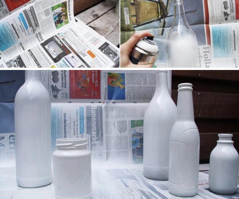 Otra buena manera de decorar una botella de vidrio es pintarla con la ayuda de un spray. El resultado queda más homogéneo, evitas la aparición de las temidas gotas de pintura que pueden afear el resultado, y consigues una textura más uniforme.