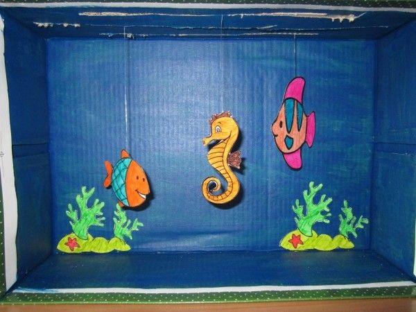 Si se trata de usar cajas de zapatos para un proyecto creativo que divierta a los pequeños, entonces reutilizarlas para convertirlas en una graciosa pecera de juguete es la alternativa ideal. Aquí los pequeños podrán pasarlo en grande dibujando el fondo marino y cada uno de los peces que habitan este acuario, para luego colgarlos con el uso de hilo transparente.
