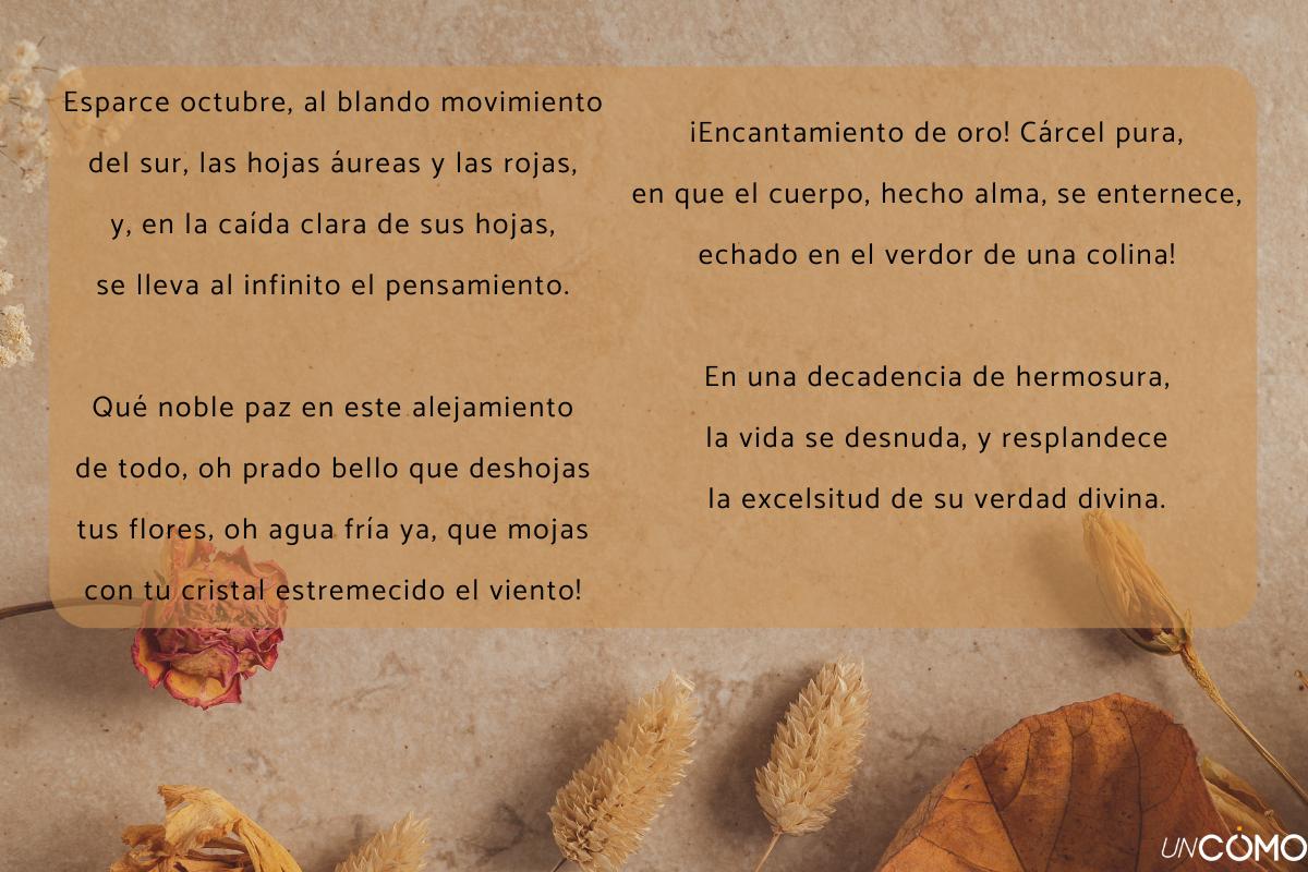 Los poemas del otoño nos invitan a contemplar la belleza efímera de esta estación y a reflexionar sobre el paso del tiempo, el cambio y la melancolía que a menudo lo acompaña. Algunos ejemplos de poemas del otoño son "Otoño de Octavio Paz" y "Amanecer de otoño" de Antonio Machado. El otoño que es la estación en que las hojas de los árboles caducos cambian y su color verde se vuelve amarillento, ha inspirado a muchos poetas a escribir sobre él.