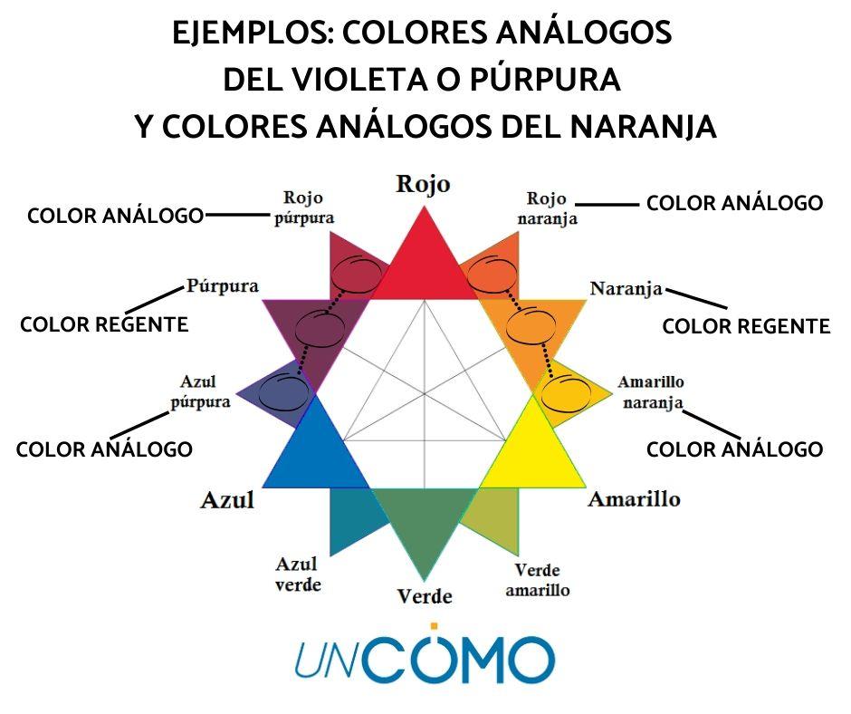 Para conocer más ejemplos de colores análogos, en unCOMO aportamos la siguiente lista. El primero de cada punto funciona como color regente y los dos que le acompañan son sus colores análogos, así, por ejemplo, si decimos que son ejemplos de colores análogos del amarillo el amarillo verdoso y el naranja amarillento, el color amarillo es el color regente y los otros dos son los análogos.