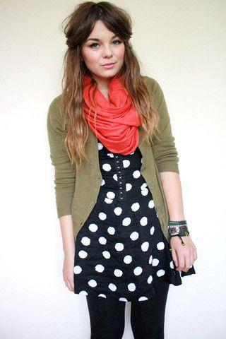 Las posibilidades no se quedan ahí. También puedes jugar a mezclar tus prendas verde militar con otras cuya combinación no es la que se esperaba. Por ejemplo, y dado que el verde militar está sobre todo triunfando en parkas, ¿por qué no combinarlo con vestidos más bien girlie? Fíjate por ejemplo en el efecto que crea una chaqueta verde militar con un vestido de lunares.