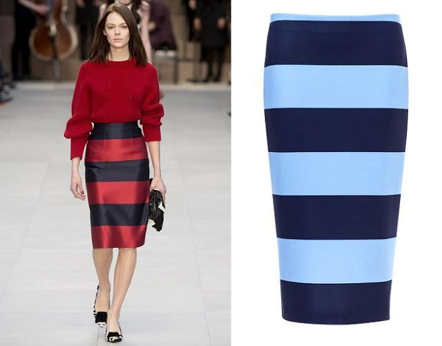 Todas tenemos una camiseta o top a rayas horizontales de lo más clásico en el armario. Combinando el top con una preciosa falda roja y un abrigo azul, queda un conjunto de lo más chic, donde las rayas son un simple detalle casi escondido bajo el binomio rojo-azul.