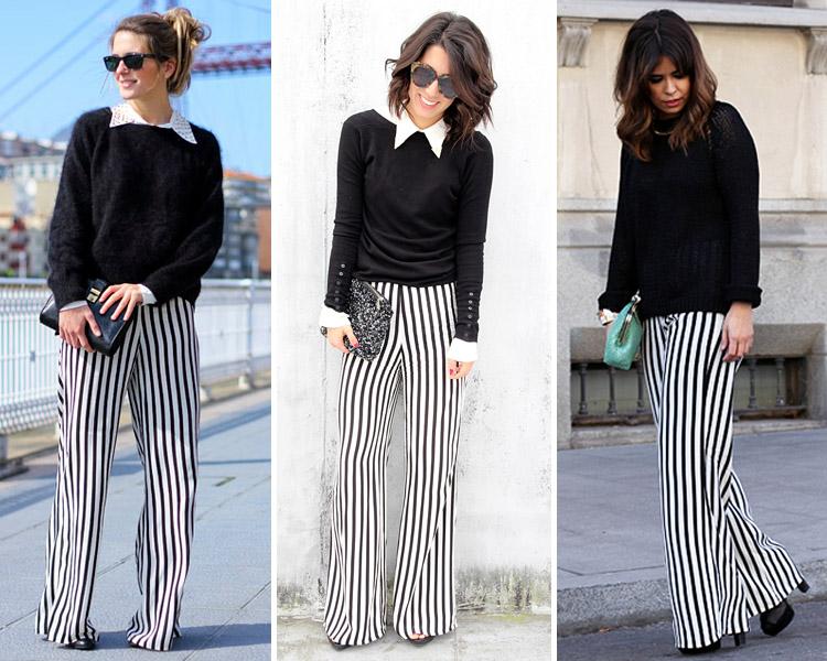Por último y para las más transgresoras, proponemos alguna buena opción para combinar un pantalón de rayas. Aunque te parezca muy atrevido, puedes llevar un pantalón de rayas y estar moderna a la par que femenina. Mira lo guapa que estarás con un jersey negro ajustado o algo holgado y con una camisa de cuello naïf.