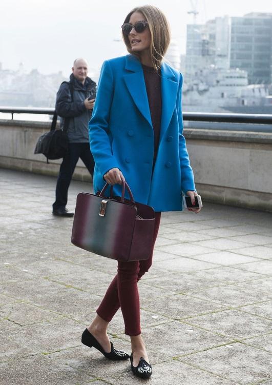 Si eres amante de la moda y seguidora de las últimas tendencias, esta combinación es perfecta para ti. Olivia Palermo, como vemos en la imagen, luce espectacular con un abrigo azul y prendas en burdeos, el color por excelencia de la temporada. Hazte con unos pitillos y un maxi bolso en burdeos, completa el look con unos slippers negros y estarás igual de ideal que la it girl del momento.
