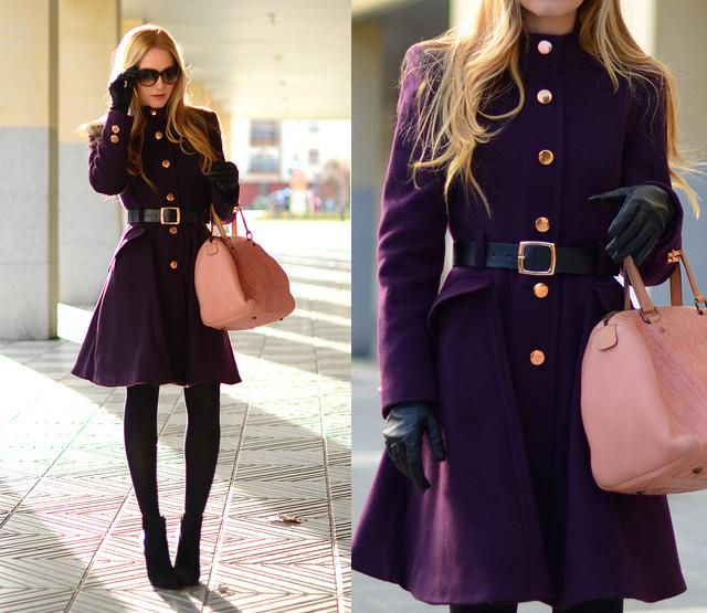 Si quieres vestir un look sofisticado puedes conseguirlo mezclando tu abrigo morado con tonalidades en negro y detalles metalizados (como el oro, la plata o el bronce).