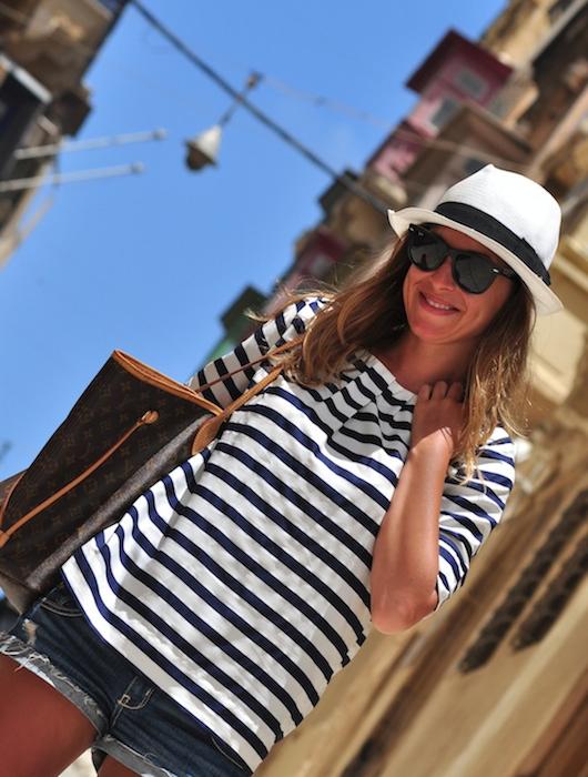 Otra buena idea para poder combinar un sombrero de playa de forma actual es hacerlo con prendas de ropa que sean de esencia marinera, de esta manera, consigues un conjunto 100% playero y perfecto, no solo para ir a tomar el sol, sino también para ir a dar un paseo en barco o para comer en un bar del paseo marítimo.