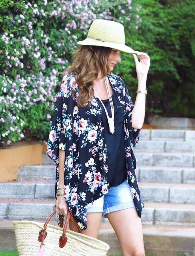 Los kimonos y los estampados orientales están de moda y no hay nada mejor que aprovechar este estampado tan informal con un sombrero de playa para darle el toque más veraniego a tu estilo. En la imagen te proponemos que combines el sombrero con un short vaquero, una camiseta lisa y, encima, te cubras con un kimono azulado con flores rosadas. Sin embargo, la combinación de estos elementos dependerá completamente del color de tu kimono y de su estampado. Ten en cuenta que el truco es que luzca él por encima de todo, por lo que evita vestir con combinaciones muy arriesgadas.