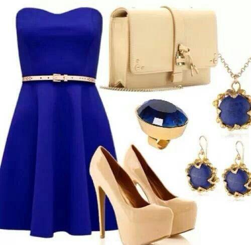 El nude es, de hecho, una fantástica opción para combinar con un vestido azul eléctrico en todos los complementos. Bolso y zapatos pueden ser de ese color.