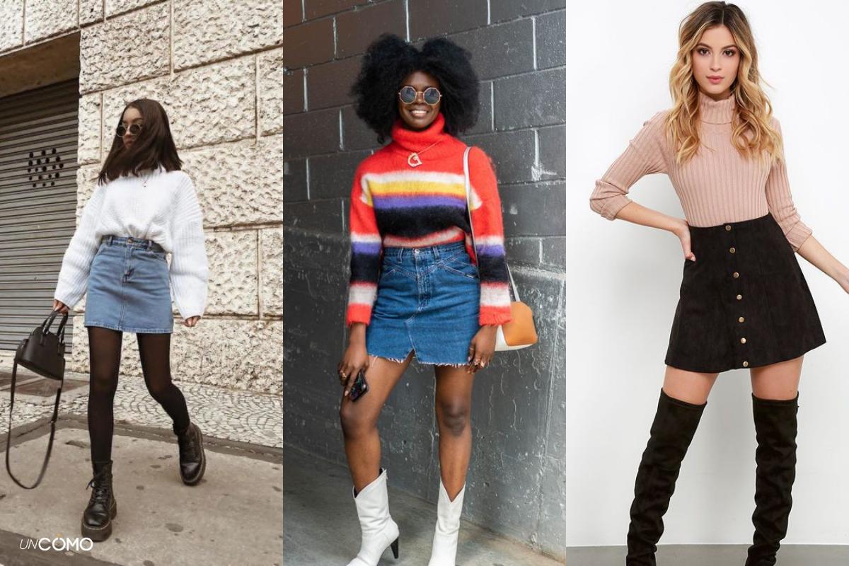 Sea lo que sea lo que te pongas en la parte superior, en invierno puedes combinar tu falda de mezclilla con unas medias tupidas y unos botines para no pasar frío. Esta combinación te permitirá ir bien cómoda sin tener que renunciar al estilo. Y si quieres algo más divertido y original, ¡apuesta por las medias de colores!