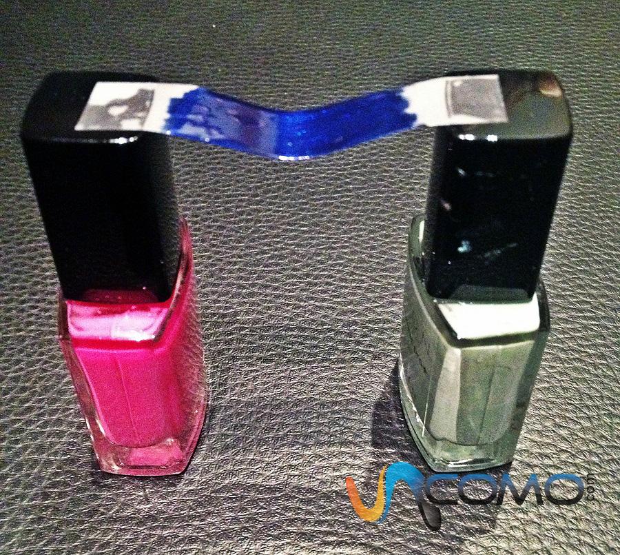Para conseguir las rayas marineras utilizaremos una cinta adhesiva. Coloca un trozo de cinta adhesiva sobre los extremos de dos esmaltes de uñas, tal y como se muestra en la imagen, y píntalo con el esmalte azul marino. Déjalo secar.