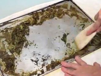 Ahora, coge una bandeja de horno, o cualquier superficie plana, extensa y apta para horno, y extiende el puré de aguacate. Debes crear una capa fina, de manera que estira la masa todo lo posible. Esto lo hacemos para facilitar el secado del aguacate y extraer después su aceite. Cuanto más fina sea la capa, más rápido se secará. Probablemente necesitarás otra bandeja porque una no será suficiente para todo el puré.