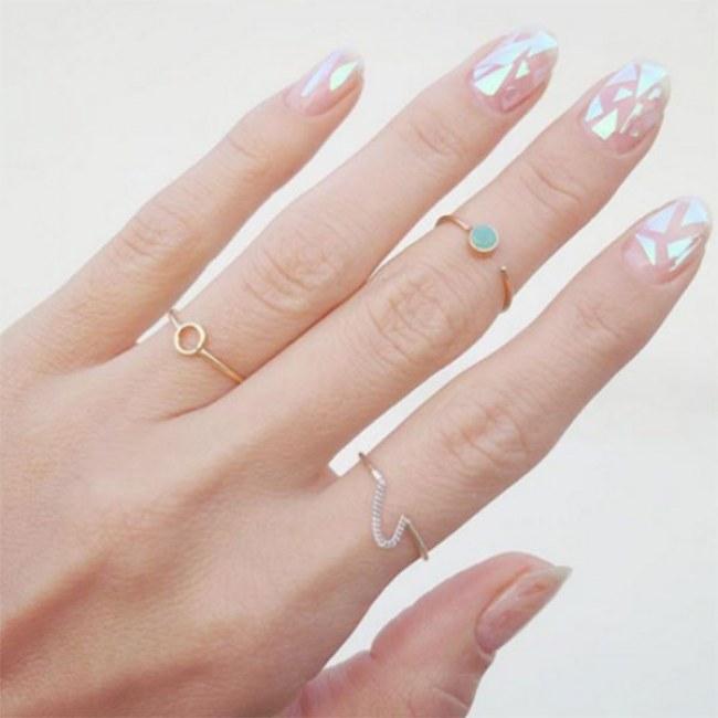 Cuando tengas los materiales necesarios, ya puedes empezar a hacer este magnífico diseño de uñas a base de pequeños cristales. El primer paso será precisamente crear esos cristalitos y para ello, deberás cortar un trozo de papel celofán tornasol y, luego, ir recortando pequeños triángulos que serán los que adheriremos a las uñas para conseguir el efecto que estamos buscando. Una vez que ya tengas bastantes, déjalos apilados en un rincón de la mesa para que no se pierdan, pues los utilizaremos más adelante.