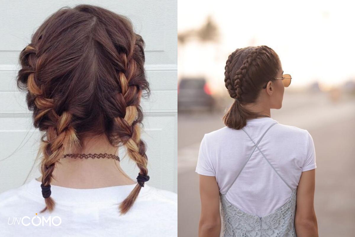 - A continuación, lleva las dos trenzas hacia atrás y átalas con una goma pequeña del mismo color de tu pelo.