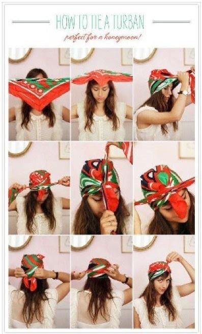 Para conseguirlo dobla el turbante a la mitad, para que quede en forma de triángulo. Colócalo sobre la cabeza, dejando que las puntas caigan hacia delante. Atálo y pasa la tela que sobra para la parte posterior.