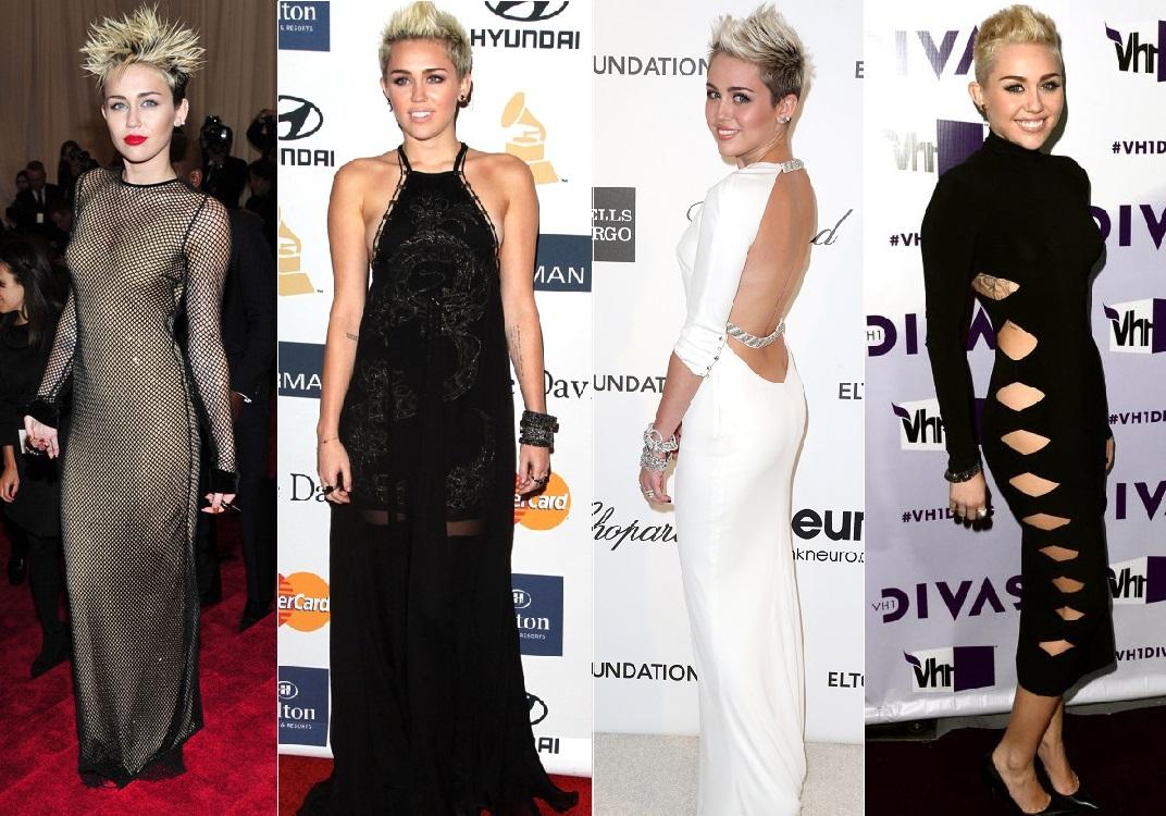 En varias ocasiones hemos visto a Miley Cyrus acudir a galas y eventos con vestidos o faldas largas, sexys y provocativos. Para vestir como ella la clave reside en las transparencias, descubiertos y los escotes. De manera que busca vestidos que cumplan con alguna de estas características. Miley suele combinarlos con zapatos de punta afilada. Normalmente escoge vestidos largos de colores oscuros pero también la hemos visto alguna vez con tonos más claros o incluso blanco. No obstante, el color o estampado no es lo relevante de este outfit de Miley, sino la forma y manera de lucirlo. Recuerda que la joven cantante siempre deja al descubierto alguna parte de su cuerpo, ya se la espalda, torso, brazos, etc.