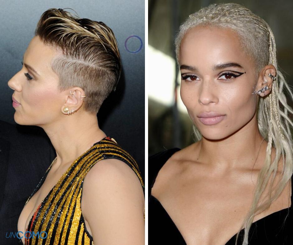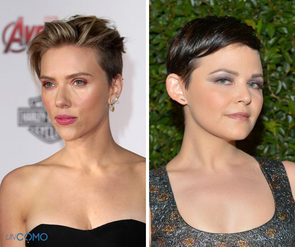 El rapado puede ser o bien completo o más bien creciente, dependiendo de lo mucho que quieras que varíen las diferentes capas de tu pelo; a la izquierda verás a Scarlett Johanson con un peinado garçon hacia arriba y los lados notablemente más cortos, mientras que a la derecha Ginnifer Goodwin presenta un estilo mucho más equilibrado e igualado.