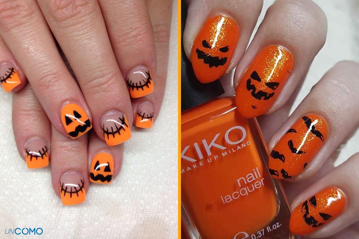 Como ves en la imagen, puedes hacerlo de diversas formas, pero siempre haciendo uso de un esmalte naranja y otro negro. Lo más sencillo es pintar la base con el esmalte naranja y con la ayuda de un pincel fino o punzón de nail art dibujar la cara de la calabaza en color negro. ¡Puedes hacer el mismo diseño en todas las uñas o ir cambiando para conseguir un acabado de lo más original!