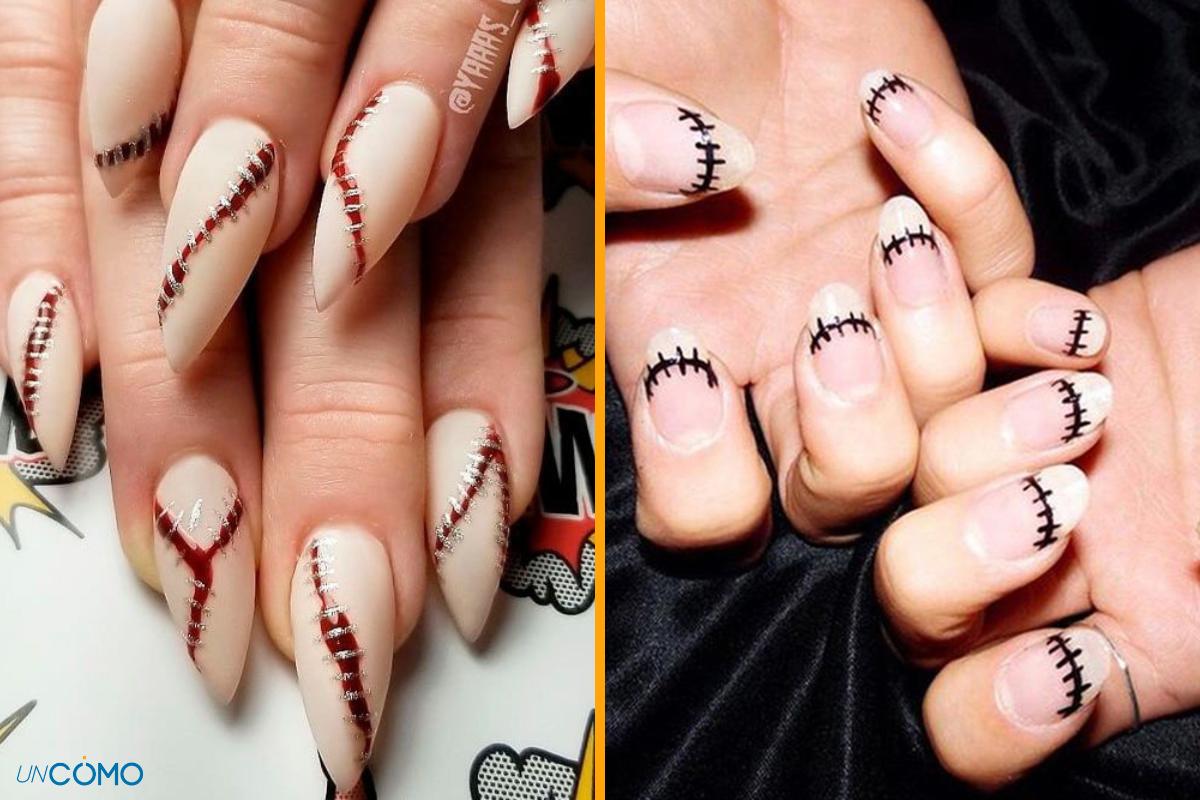 Este es otro de los diseños de uñas para Halloween fáciles de hacer y perfecto para combinarlo con cualquier disfraz o vestimenta en Halloween. Dibujando una simple cicatriz en negro a lo largo de la uña sobre una capa de esmalte blanco, puedes conseguir una manicura bastante original y adaptada a la ocasión. Procura que los trazos de las cicatrices sean de diferente longitud haciéndolos unos más largos que otros para darle más realismo. También puedes añadir toques de rojo para simular la cicatriz o sangre.