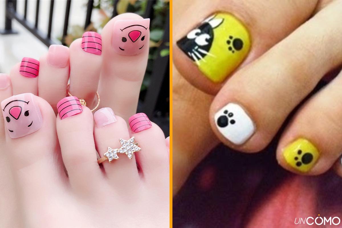 Si quieres un diseño de uñas de pies fácil y un poco más divertido y atrevido, siempre es una buena opción llenar tus uñas de los pies de color con diseños de animales como mariquitas, gatos, tortugas o perros. Debes usar cada uña como un mini lienzo y contar con un pincel fino para los detalles. Puedes usar la uña del dedo gordo, que es la más grande, para hacer el rostro del animal que quieras y, para las pequeñas, hacer un juego de formas con los mismos colores para que sea todo el pie temático.