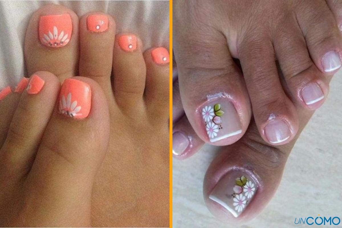 Para tener las uñas de los pies decoradas sencillas y bonitas a partir de diseños florales, primero debes elegir un color de fondo. Lo recomendable es un color como el blanco, el granate o el azul cielo, para crear contraste. Después, deberás elegir el color de los pétalos e ir dibujándolos en la parte que quieras y con el tamaño deseado.