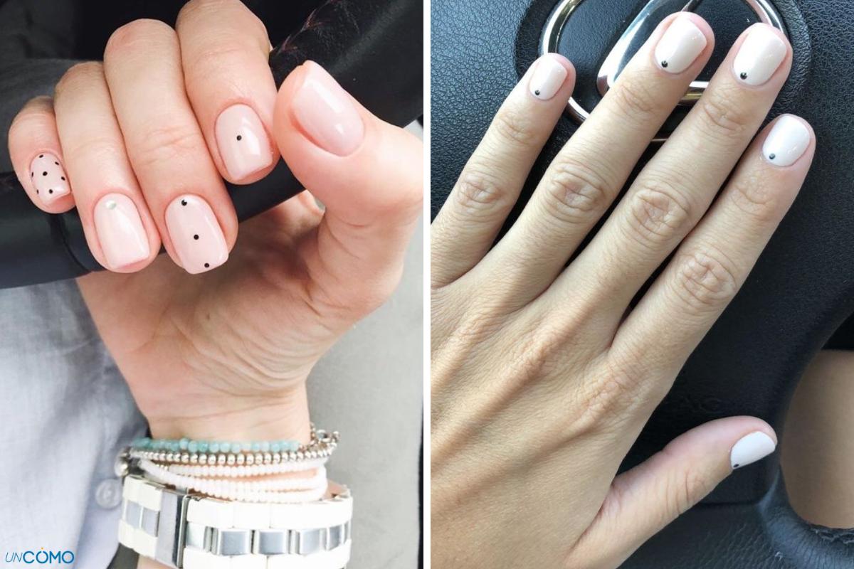 Uno de los diseños más fáciles y al mismo tiempo más llamativos dentro del estilo minimalista son las uñas minimalistas con puntos. Basta con aplicar una base neutra (blanco, nude o transparente) y colocar uno o dos puntos en cada uña, ya sea centrados, en la cutícula o hacia los laterales. Puedes usar colores sobrios como negro o burdeos para mantener la estética minimalista, o colores pastel para un toque primaveral. Esta tendencia demuestra que con un solo elemento gráfico se puede lograr un resultado elegante y moderno.