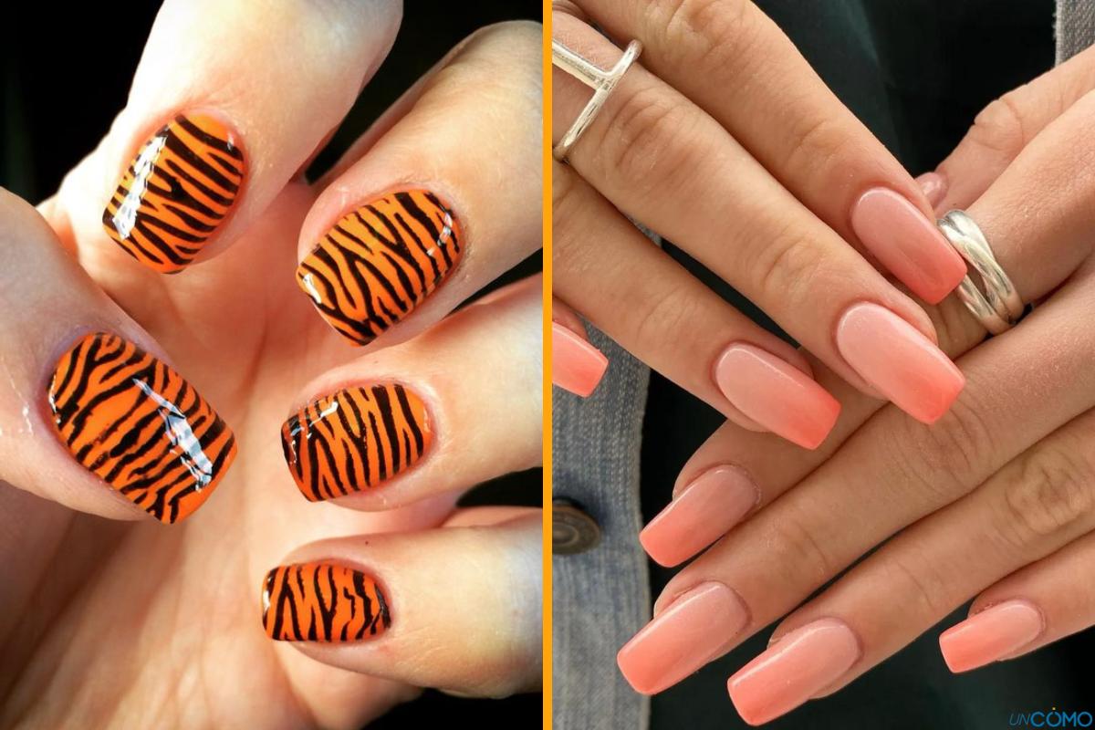 El animal print es una tendencia que nunca pasa de moda. Prueba con un diseño de leopardo o cebra en tonos naranjas para una manicura audaz y salvaje. Este diseño es ideal para quienes quieren añadir un toque de actitud y diversión a sus uñas. Puedes lucirlo tanto con un look casual, como con tu mejor vestido para una noche de vacaciones.