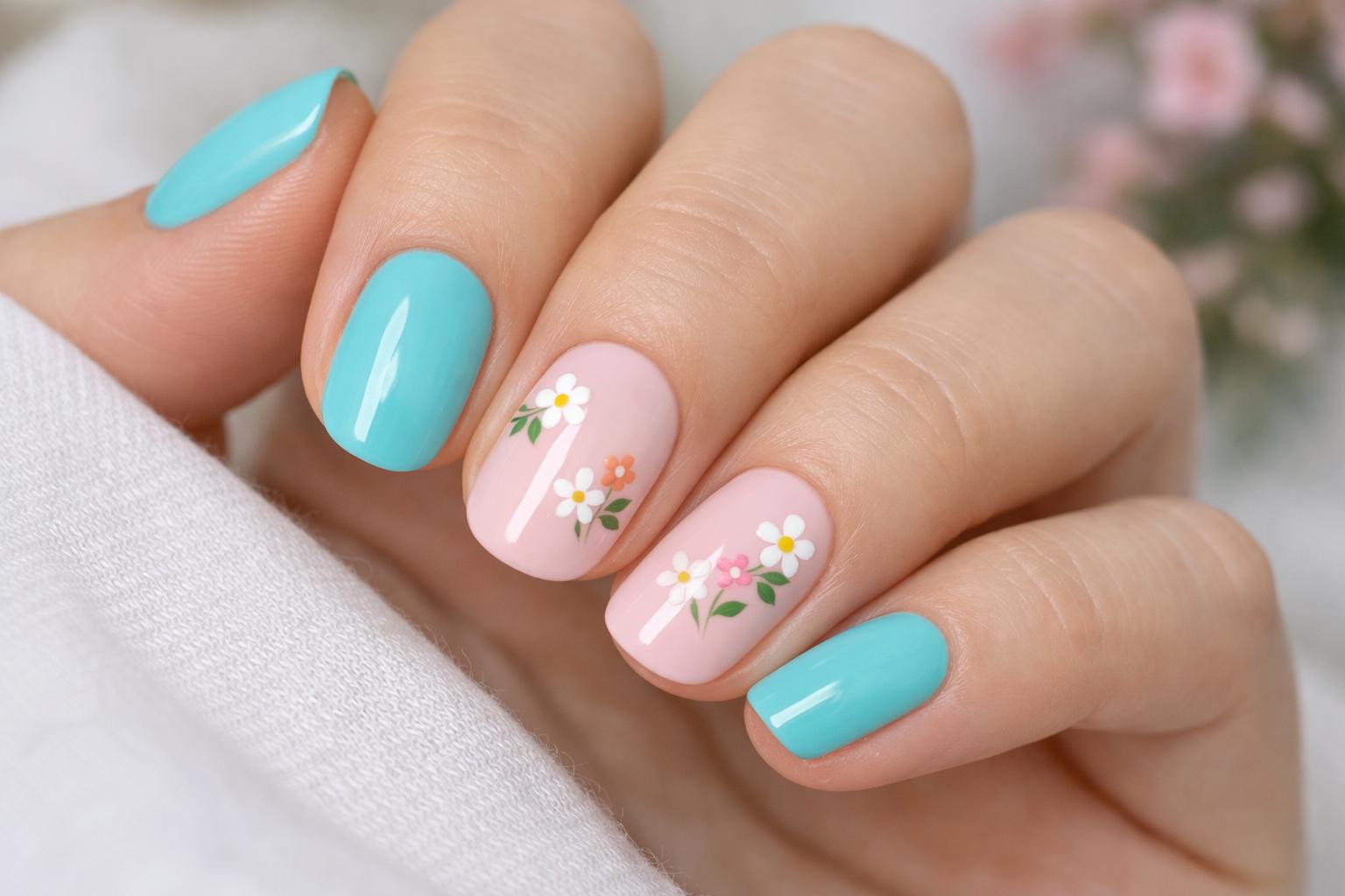 Uñas turquesa y rosa con flores minimalistas