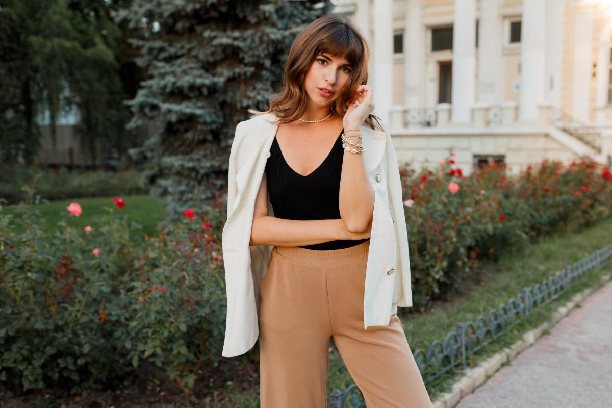 El blazer es otra prenda clave para el entretiempo. Su estructura aporta un toque formal al look, pero cuando lo combinas con una camiseta básica y unos pantalones culotte, logras un estilo moderno y relajado. Los pantalones culotte, con su corte ancho y fluido, son ideales para mantenerte fresca durante el día y abrigada por la tarde.