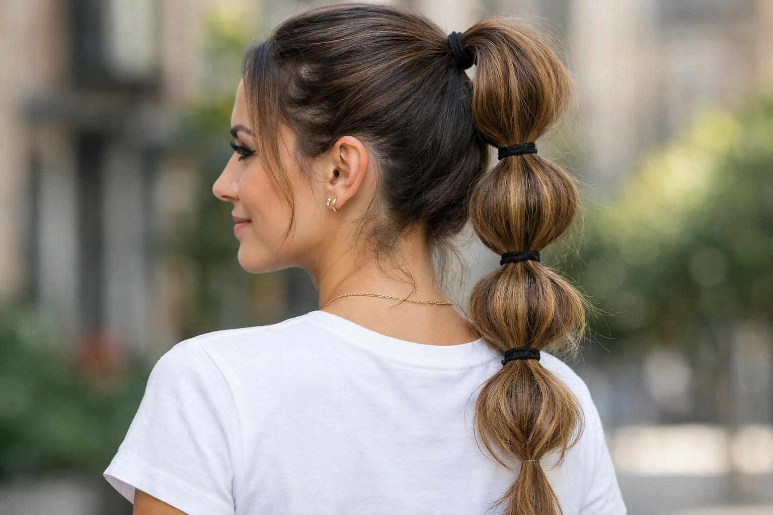 La coleta burbuja es divertida y diferente. Consiste en hacer una coleta tradicional y colocar varias gomas a lo largo del cabello, separadas por algunos centímetros. Después, se ahuecan ligeramente las secciones entre gomas para crear el efecto “burbuja”. Es uno de los peinados fáciles en 5 minutos más originales y perfectos para dar un toque creativo al look diario sin complicarse demasiado.