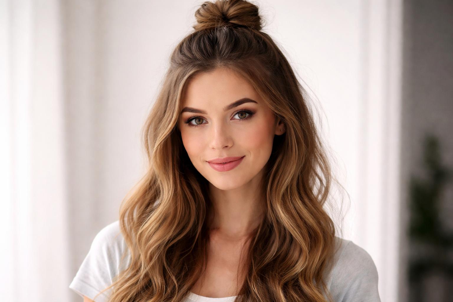 El half bun combina cabello suelto con un pequeño moño en la parte superior. Solo necesitas recoger la mitad superior del cabello y enrollarla en un pequeño recogido. Es juvenil, moderno y extremadamente práctico. Dentro de los peinados rápidos y fáciles, es uno de los favoritos porque funciona tanto en cabello liso como rizado.