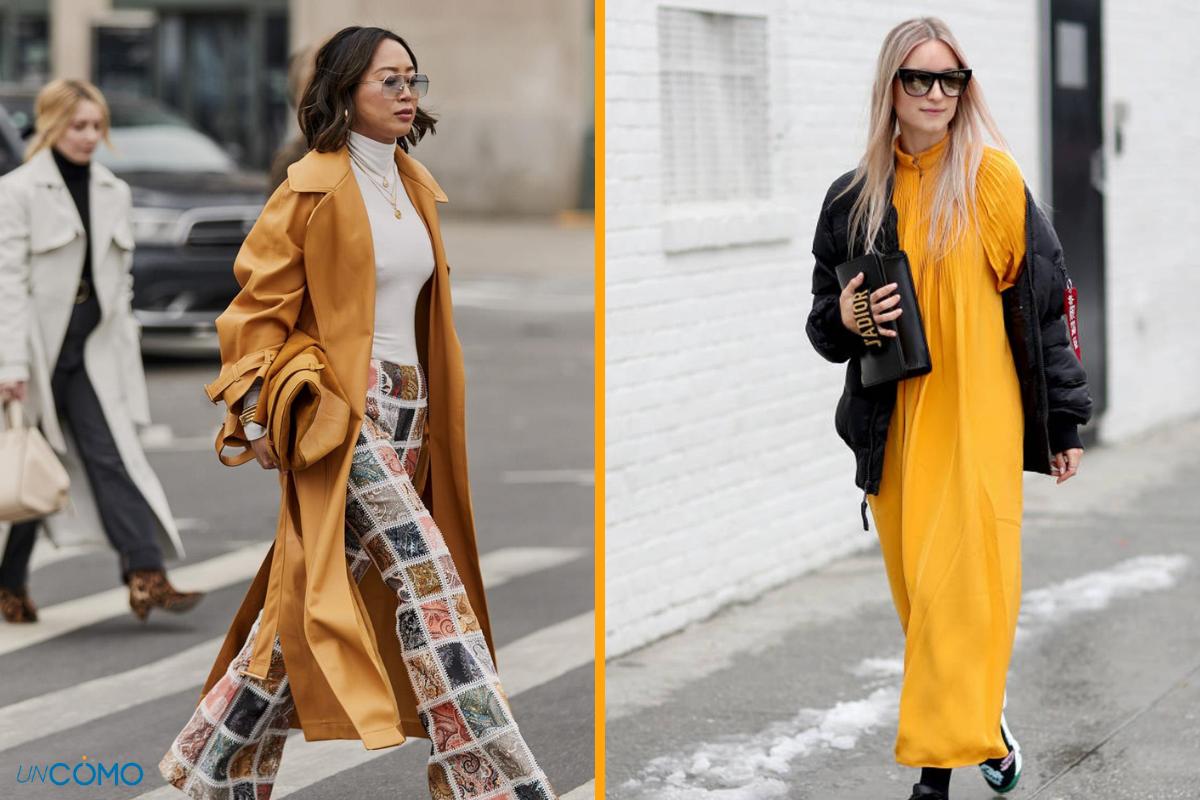 Puedes apostar por un total look en amarillo mostaza o, si prefieres ir sobre seguro, combinarlo con tonos neutros como gris, negro o marrón, logrando un conjunto equilibrado y moderno. Este color funciona muy bien en abrigos, jerséis, faldas y accesorios, aportando un toque vibrante a cualquier outfit invernal.