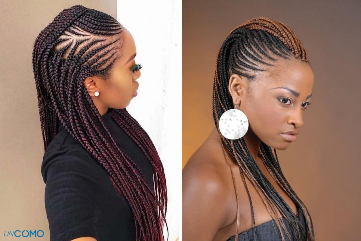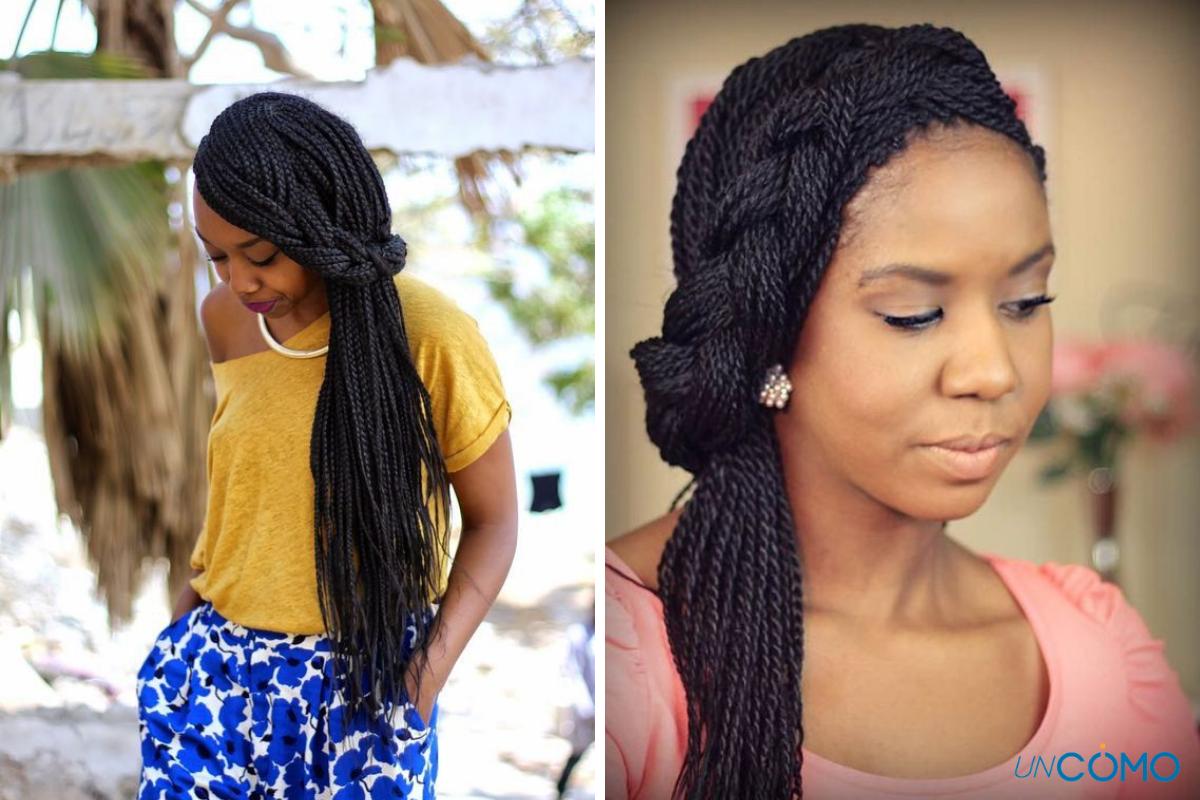 Se trata de recoger uno de los lados del cabello en trenzas hacia arriba y sostenerlas con horquillas invisibles, mientras dejas el resto del cabello suelto, con una coleta o con trenzas. Es una forma de verte diferente con tus trenzas africanas sin tener que recoger todo el cabello.