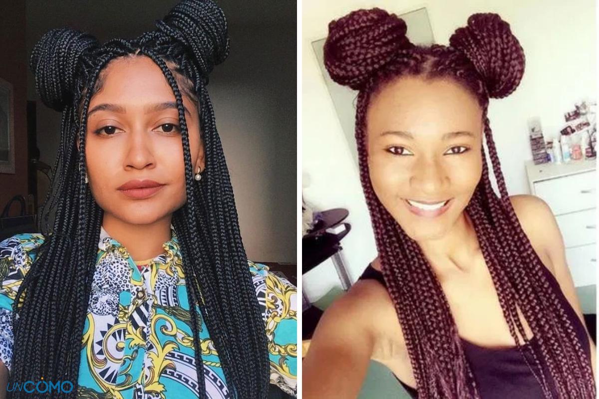 Otro peinado que puedes hacer llevando las trenzas africanas sueltas es hacer dos moños altos tipo top knot y dejar el resto del cabello suelto. Para hacer estos peinados de trenzas africanas paso a paso, solo tienes que hacer lo siguiente:
