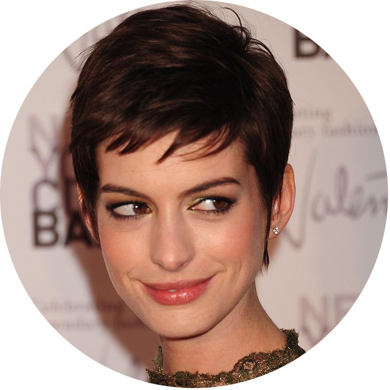 Qué mejor que un corte de poco pelo para una melena con poco pelo: esta es la magia del pixie, el corte que marcó tendencia en todas las actrices del espectáculo y que sin duda es elegante, coqueto, bohemio, audaz y versátil al mismo tiempo. El pixie es uno de los peinados para disimular el poco pelo porque sugiere un estilo muy corto, así que va genial con tu necesidad. Mira qué guapo le luce a Anne Hathaway.