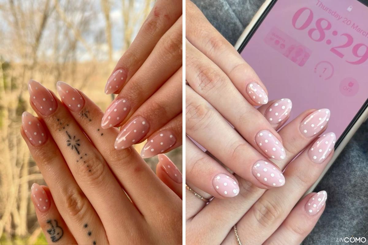 Las amantes del minimalismo pueden encontrar en esta versión su favorita. Una base nude con efecto glaseado aporta un acabado limpio y pulido, mientras que los lunares pequeños en tonos suaves, como beige o blanco, crean un look elegante pero sutil.